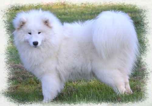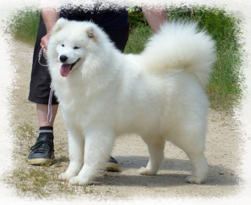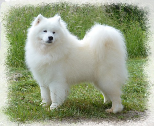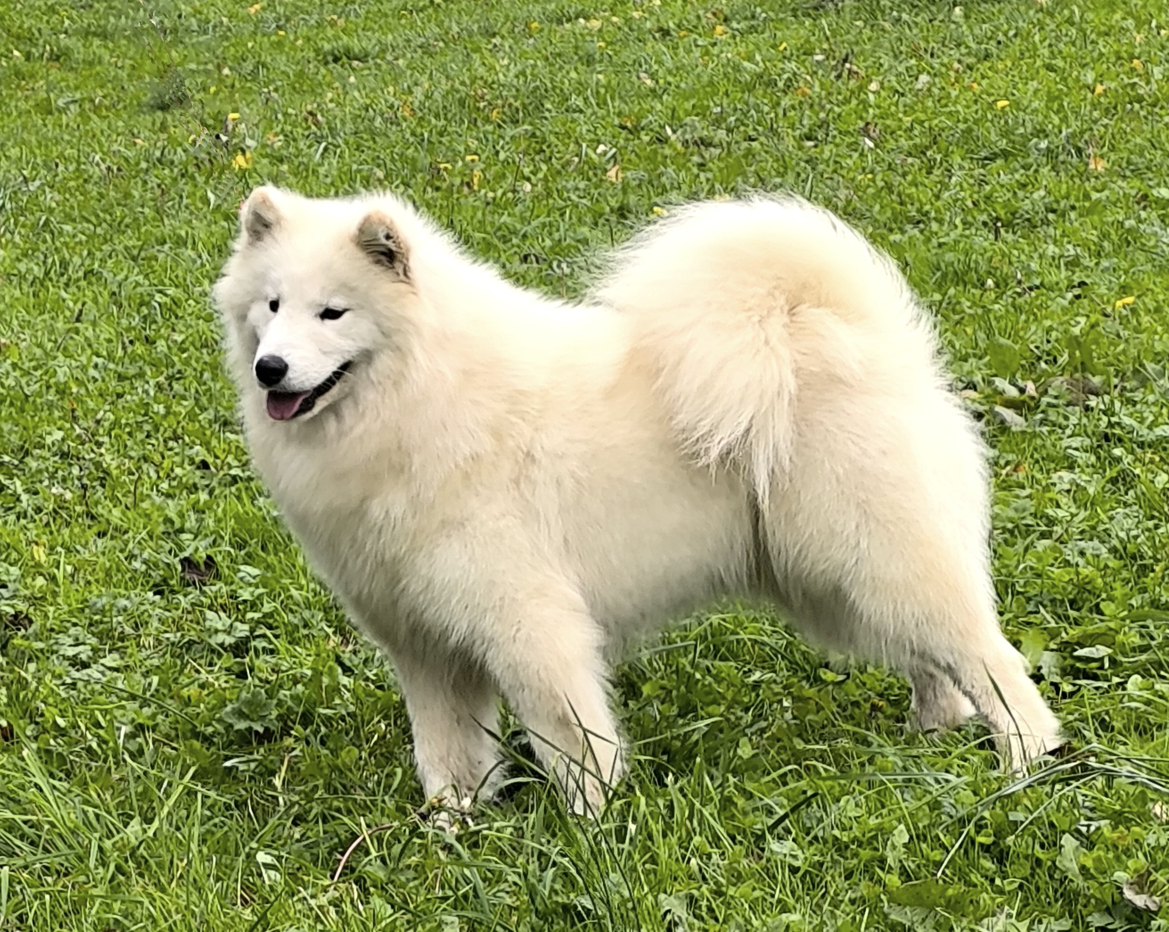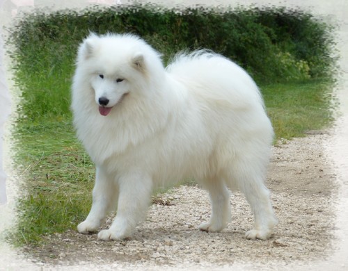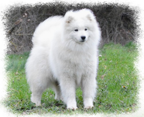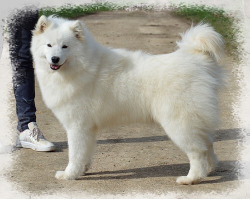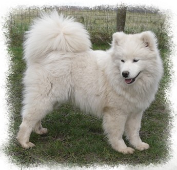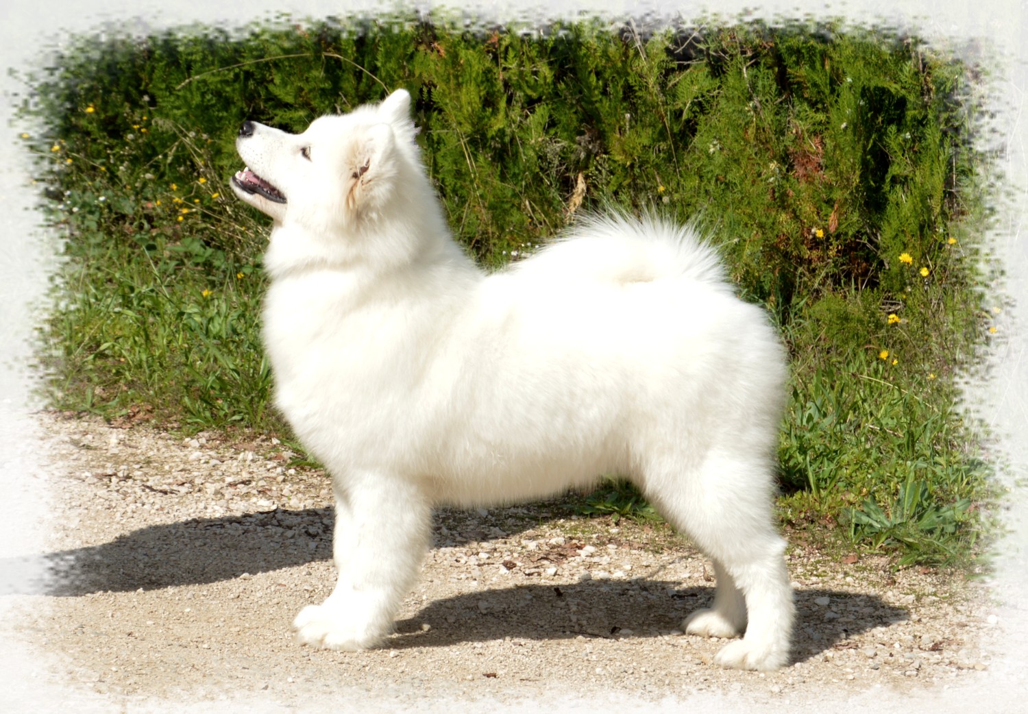 BREF APERCU HISTORIQUE : Le nom « Samoyède » vient des tribus Samoyèdes de la Russie septentrionale et de la Sibérie. Dans les régions situées au sud de cette zone, on utilisait, pour garder les troupeaux de rennes, des chiens blancs, noirs ou tachés de marron. Au nord, les chiens étaient d’un blanc pur, étaient doux de caractère et on les utilisait comme chiens de traîneau et chiens de chasse. Les chiens Samoyèdes ne quittaient pas leur propriétaire, dormant même à l’intérieur des abris où ils servaient de source de chaleur. Le zoologiste britannique Ernest Kilburn Scott passa trois mois avec des tribus Samoyèdes en 1889. Il ramena avec lui en Angleterre un chiot mâle marron appelé « Sabaka » (= « chien » en russe). Plus tard il importa une femelle de couleur crème appelée « Withey Petchora » du versant occidental de l’Oural et un mâle d’un blanc neige du nom de « Musti » de Sibérie. Ces quelques chiens et ceux ramenés par les explorateurs forment la base de l’élevage du Samoyède occidental. Le premier standard fut rédigé en Angleterre en 1909.