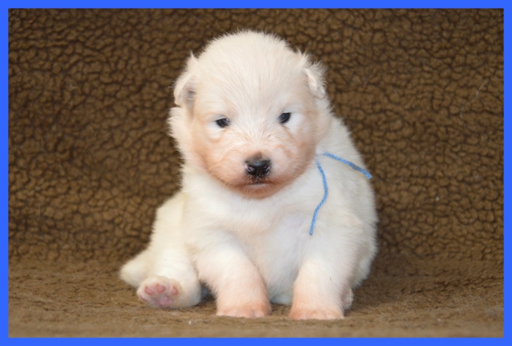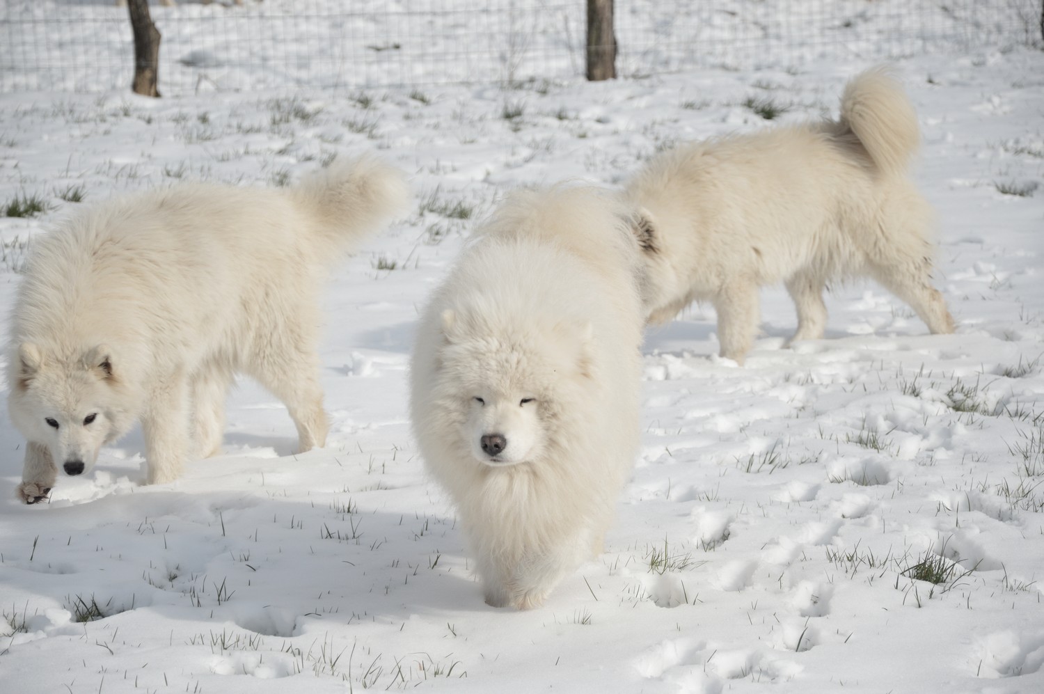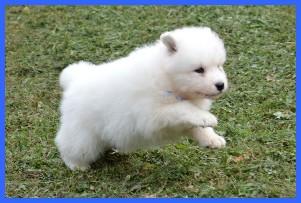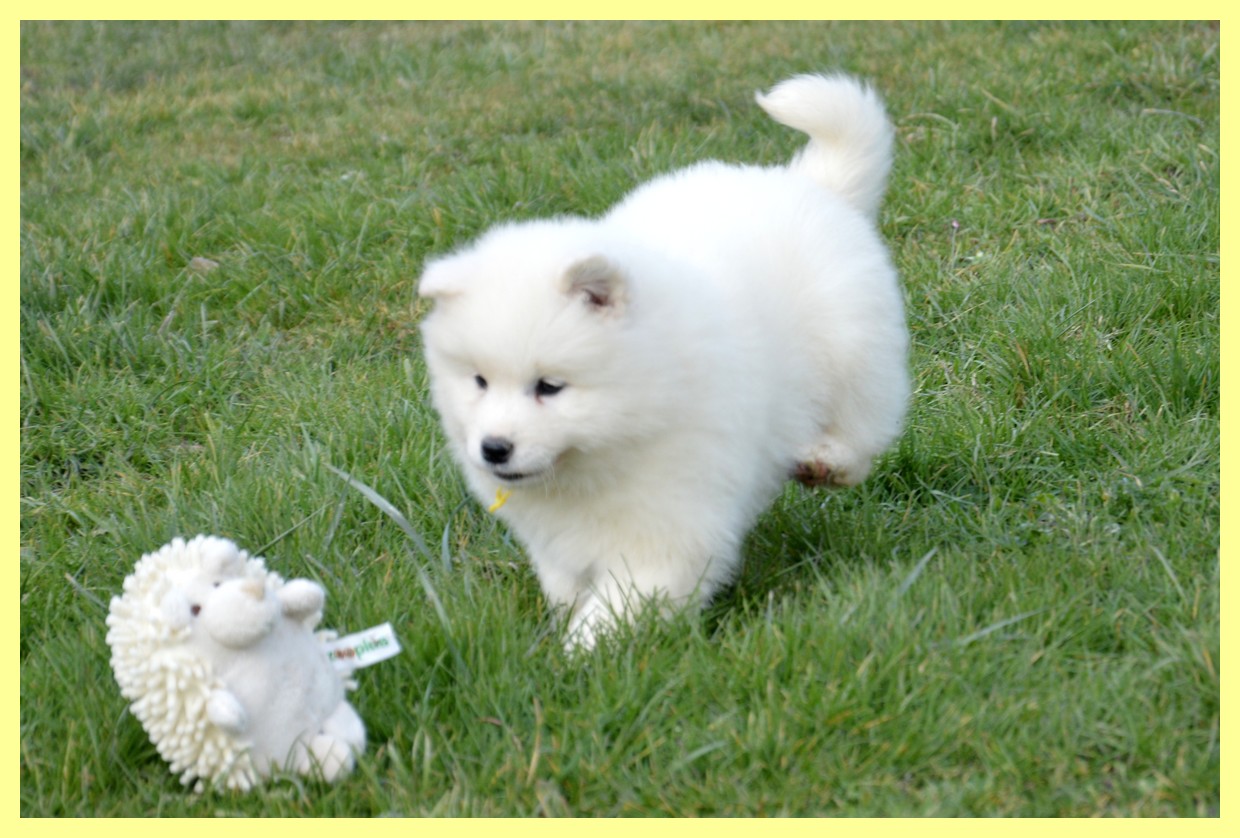 BREF APERCU HISTORIQUE : Le nom « Samoyède » vient des tribus Samoyèdes de la Russie septentrionale et de la Sibérie. Dans les régions situées au sud de cette zone, on utilisait, pour garder les troupeaux de rennes, des chiens blancs, noirs ou tachés de marron. Au nord, les chiens étaient d’un blanc pur, étaient doux de caractère et on les utilisait comme chiens de traîneau et chiens de chasse. Les chiens Samoyèdes ne quittaient pas leur propriétaire, dormant même à l’intérieur des abris où ils servaient de source de chaleur. Le zoologiste britannique Ernest Kilburn Scott passa trois mois avec des tribus Samoyèdes en 1889. Il ramena avec lui en Angleterre un chiot mâle marron appelé « Sabaka » (= « chien » en russe). Plus tard il importa une femelle de couleur crème appelée « Withey Petchora » du versant occidental de l’Oural et un mâle d’un blanc neige du nom de « Musti » de Sibérie. Ces quelques chiens et ceux ramenés par les explorateurs forment la base de l’élevage du Samoyède occidental. Le premier standard fut rédigé en Angleterre en 1909.